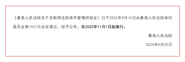 最高人民法院于2025年10月11日发布《最高人民法院关于互联网法院案件管辖的规定》(法释〔2025〕14号),对互联网法院的案件管辖范围进行了调整。新规自2025年11月1日起施行,标志着互联网法院的发展进入新的阶段和章程,从侧重“审理机制创新”转为聚焦“治网裁判规则输出”。
