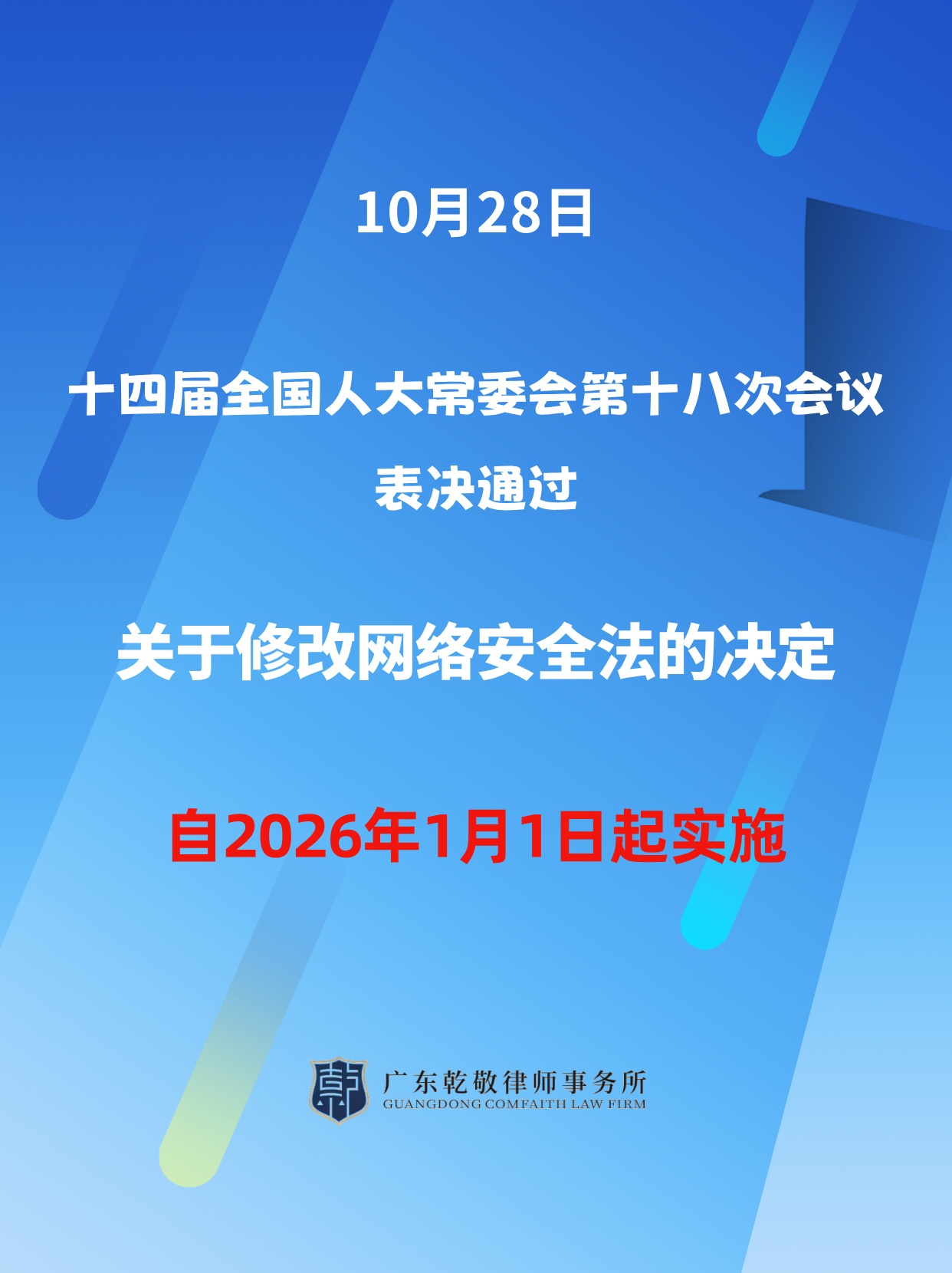 十四届全国人大常委会第十八次会议于2025年10月28日表决通过关于修改《中华人民共和国网络安全法》的决定,修订后的法律将自2026年1月1日起正式施行。