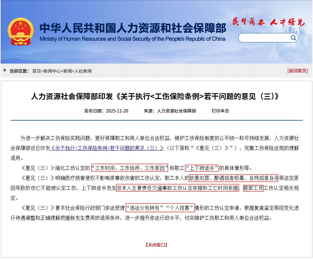 2025年11月20日,人力资源社会保障部印发《关于执行<工伤保险条例>若干问题的意见(三)》,对当前工伤认定中的难点、模糊点作出重要补充。新规主要亮点如下: