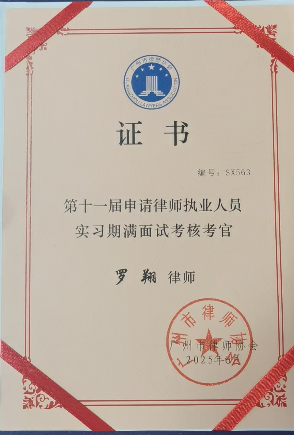 近日,广东乾敬律师事务所喜讯频传!我所主任罗翔律师凭借深厚的专业素养与丰富的实务经验,先后荣任广东省法学会医药食品法学研究会理事(活动现场图),并荣获第十一届申请律师执业人员实习期满面试考核考官(荣誉证书),彰显了罗翔主任在法律实务与学术研究领域的双重影响力。
