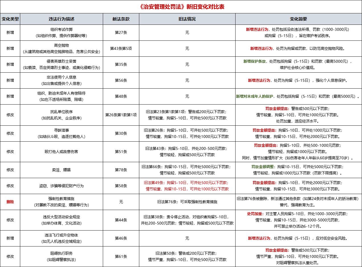 | 新增 | 侵害英雄烈士荣誉 (如亵渎、否定英雄烈士事迹,或美化侵略行为) | 第35条 | 无 | 新增保护条款,处罚包括拘留(5-15日)和罚款(最高5000元), 维护社会核心价值观。 |