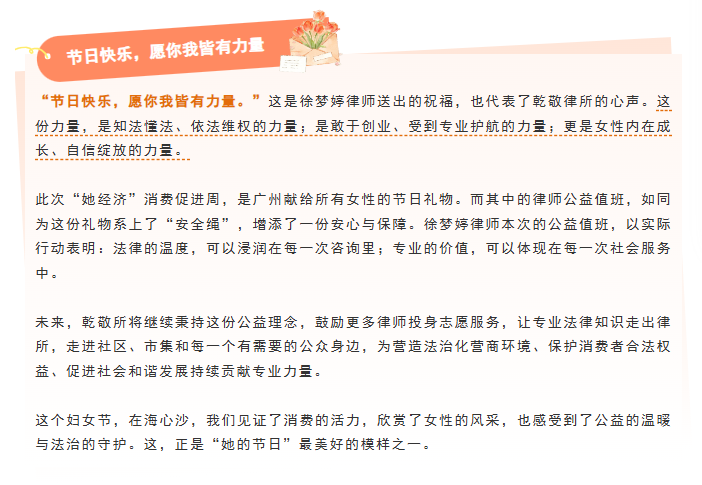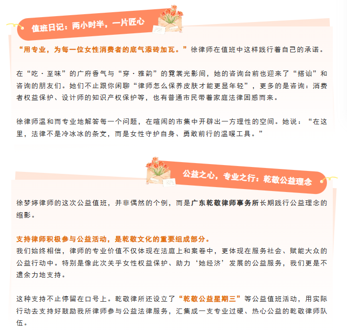 在这场展现“她力量”的盛会中,一抹专业的“法律亮色”格外引人注目——羊城律政佳人志愿服务队的公益律师值班点。而我所徐梦婷律师正是其中一员,为前来咨询的朋友提供温暖而专业的法律服务。
